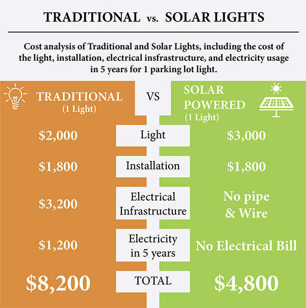 The price for a solar street light may initially be a deterrent for interested parties until you scrutinize the monetary details. The biggest difference between the price of traditional and solar lights lies in fees associated with building the electrical infrastructure for traditional lighting.